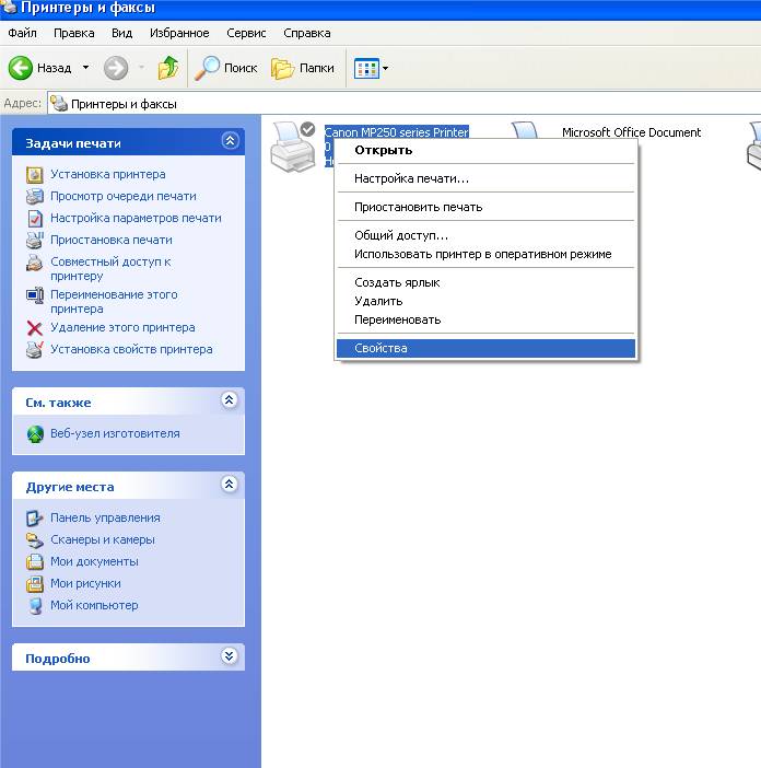 - выберите нужный вам принтер и наведите на него курсором. Нажав правую кнопку, вы увидите небольшое меню, из которого вам нужно выбрать пункт свойства;