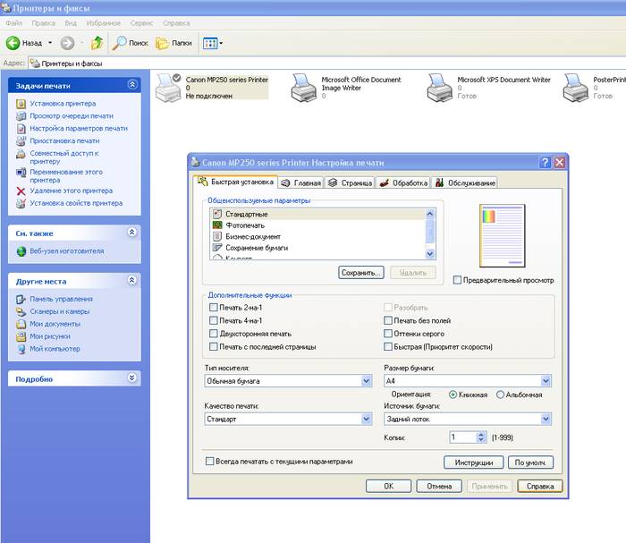 Для каждого принтера эти настройки могут быть разными, но стандартные присутствуют для всех.
