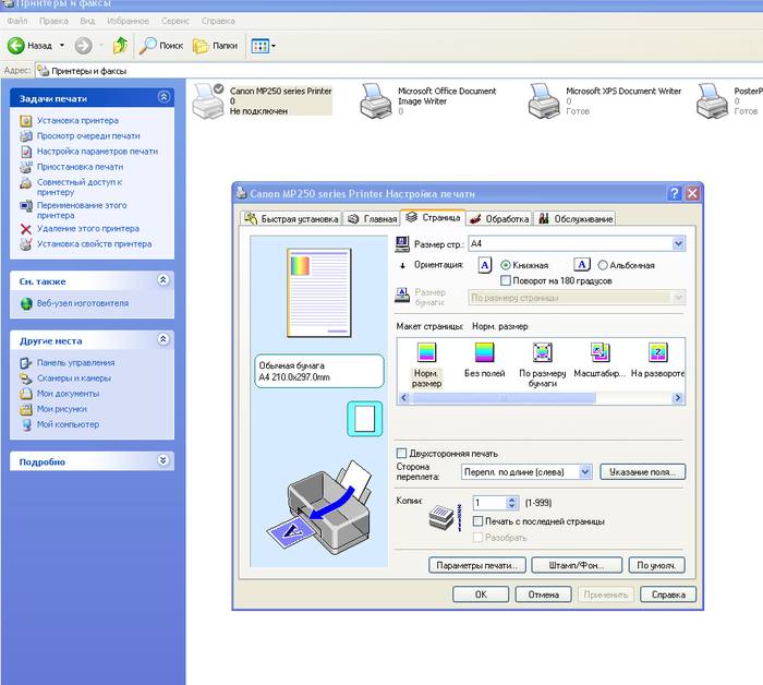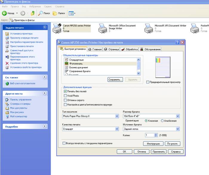 Перед вами вновь откроется окно с настройками, на разных компьютерах они могут отличаться. Но в целом, вам просто нужно выбрать нужные параметры и сохранить их. А затем просто распечатать пробную страницу и посмотреть результат.