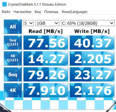 Скоростные характеристики встроенного диска типа eMMC примерно как и других подобных дисков низкого класса.