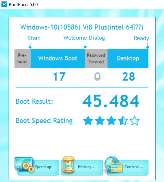 Для измерения среднего времени загрузки я использовал программу BootRacer. Полученный результат – 45 секунд.
