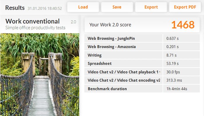 В синтетическом тесте PCMark был выбран сценарий Work, который имитирует работу с офисными документами, серфинг в интернете и видеоконференцсвязь. Как вы можете видеть, результат Chuwi Vi8 Plus довольно скромный – 1468 очков.