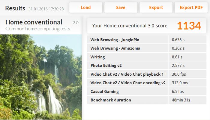 В режиме Home, при котором PCMark имитирует набор документов, просмотр интернета, чат в Skype и казуальные игры, результат получился ниже – 1134 бала.