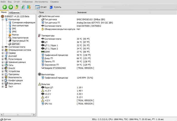 Сам запуск осуществляется двойным кликом по исполнительному файлу программы (aida64.exe или aida.exe, соответственно для 64 битной и 32 битной версии). После запуска, в левой части окна программы (озаглавлено «Меню») необходимо выбрать пункт «Датчики», после чего справа отобразятся показания всех температурных датчиков, имеющихся в системе. Полезно проверить температурные показания при работе ресурсоёмких приложений, т.к. при нагрузке они повышаются.