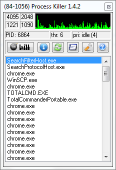 Process Killer – программа для принудительного завершения зависшего процесса в Windows. Очень маленький, тихий и мощный монстр. Каждый уважающий себя пользователь персонального компьютера просто обязан иметь в арсенале такой изысканный инструмент для легкой и быстрой расправы с нестабильными приложениями. Моментальное завершение процесса – конек программы Process Killer.