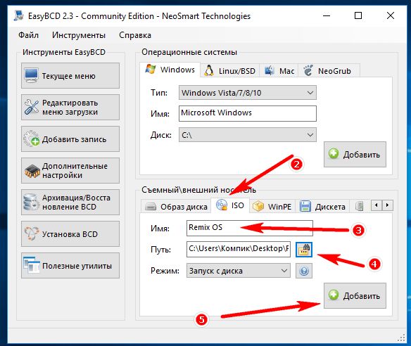 Выберите на панели меню «Добавить запись», в разделе «Съемный внешний носитель» выберите вкладку ISO, в поле «Имя» впишите Remix OS, а в поле «Путь» укажите путь к ранее скачанному загрузочному образу ISO и нажмите нижнюю кнопку «Добавить».