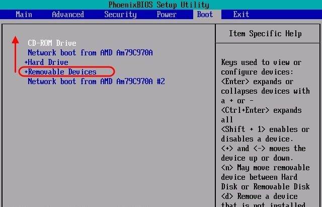 - при помощи клавиш «+» и «-» меняем очередность. Первым должно стоять извлекаемое устройство (Removable Device);