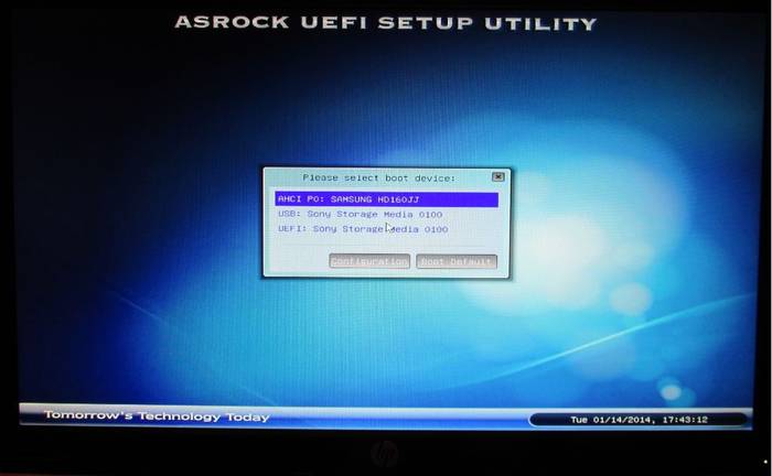 В результате вы должны увидеть сине-голубой фон с надписью Asrock UEFI setup utility. В меню «Please select boot device» нужно выбрать необходимое устройство для загрузки.