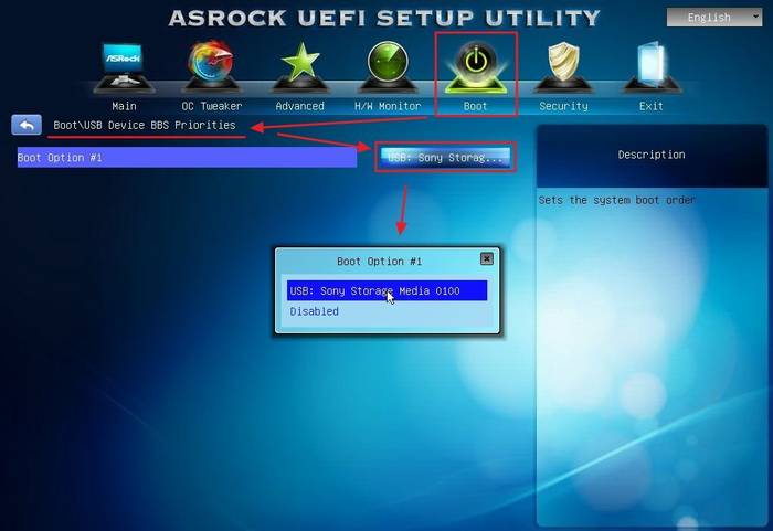 - перейти к изменению приоритета, активировав «Параметр загрузки №1», где необходимо выбрать USB устройство;