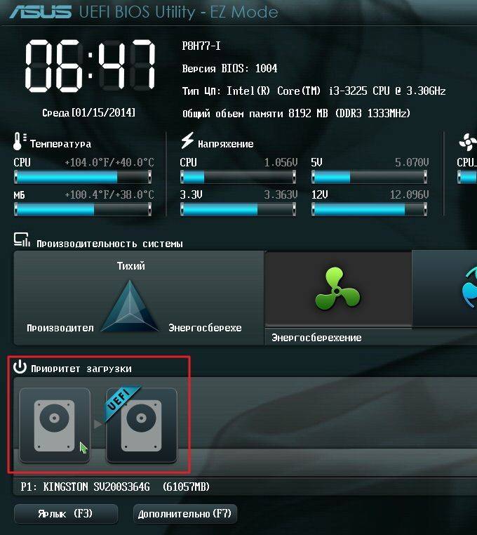 Для упрощения действий предусмотрен режим первичной настройки и дополнительный. В функции первичной настройки, то есть в главном окне, в которое вы попадаете при загрузке Bios, есть возможность выбора приоритета запуска. На картинке USB оно обозначено как с uefi.