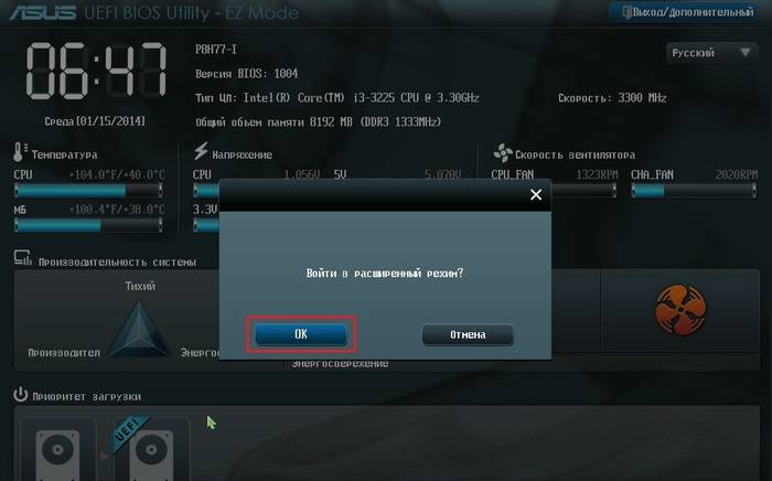 Если после перезапуска системы загрузка с флешки не началась, необходимо перейти в «Расширенный режим». Это можно сделать при помощи кнопки «Дополнительно» или нажав клавишу «F7».