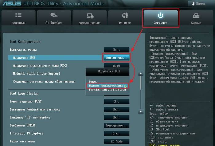 - найти пункт «Поддержка USB» и присвоить ему параметр «Полная инициализация»;