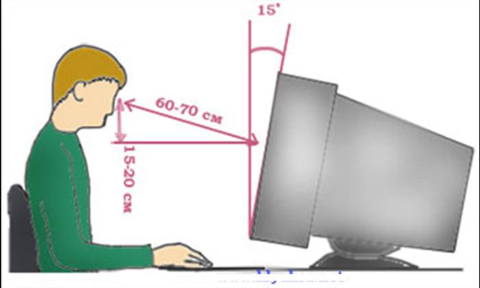 - монитор находится на расстоянии равной длине руки пользователя. Если диагональ экрана более двадцати дюймов, то дистанция больше;