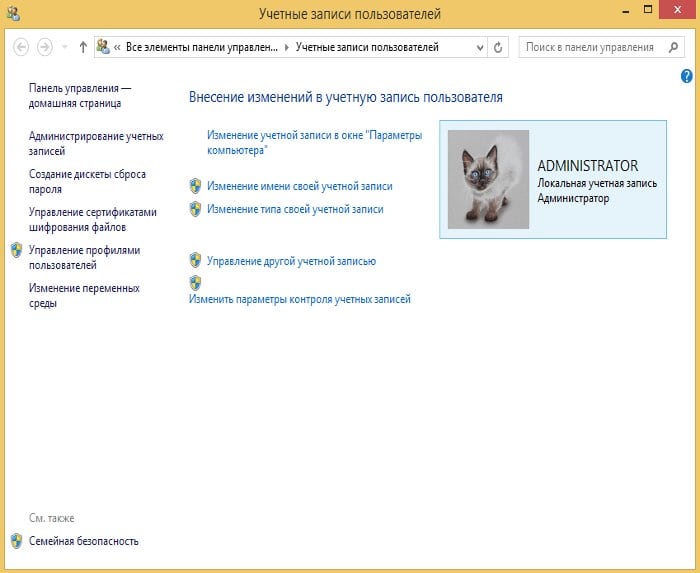 Настраивать учетные записи пользователей вы можете через панель управления. У вас есть возможность изменять параметры контроля учетных записей, изменение переменных сред, управлять другой учетной записью этого компьютера, изменять тип своей учетной записи, изменять, настраивать параметры входа, подключить любое изображение в качестве аватар и многое другое. Для этого: