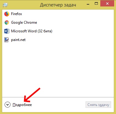 Кнопка для раскрытия подробного списка процессов Windows - Теперь ищем во вкладке «Процессы» все строки с названием этой программы. Когда вы найдёте одну из них, выберите её курсором и внизу нажмите кнопку «Снять задачу»;