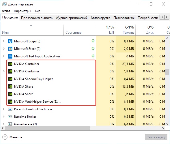 Процессы, связанные с NVIDIA GeForce Experience - Внимательно изучите все процессы, чтобы не пропустить ни одного. Обычно они расположены рядом друг с другом в списке.