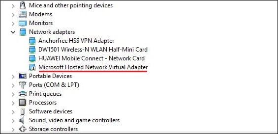 - Прокрутите вниз, найдите в списке «Сетевые адаптеры», и откройте данную ветку кликом на неё. Найдите «Microsoft Hosted Network Virtual Adapter» или аналог (если не видите таковых, тогда нажмите вверху на «Вид», и чуть ниже на «Показать скрытые устройства»);