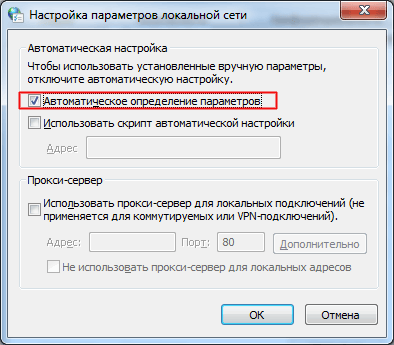 - Установите автоматическое определение параметров прокси-сервера. Перейдите в Хром – Настройки – Дополнительные, и нажмите на надпись «Настройки прокси-сервера». Откроется окно свойств интернета. Перейдите на вкладку «Подключения», там нажмите на кнопку «Настройка сети». В открывшемся окне поставьте галочку рядом с опцией «Автоматическое определение параметров», нажмите на «Ок». Затем перезагрузите ваш браузер;