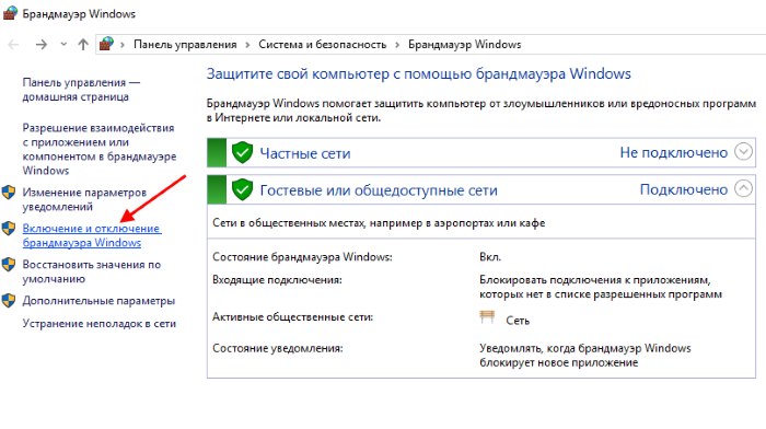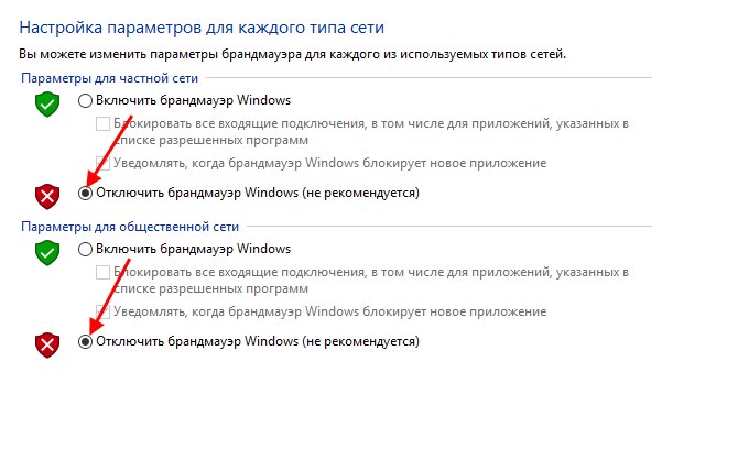 Пункт «Включение и отключение Брандмауэра» - Поставьте галочки на пунктах «Отключить» на всех типах сети и сохраните настройки.