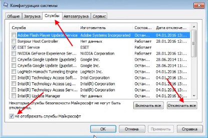 Выбор служб Windows в 7 версии - Внизу открытого окна поставьте галочку «Не отображать все», а справа «Отключить службы» и подтвердите свои действия;
