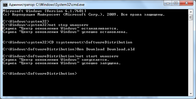 Командная строка в меню «Пуск» - Теперь нужно вводить команды и подтверждать их выполнение, нажимая клавишу «Enter» после каждой: «net stop wuauserv», «Net Starn wuasurv», «CD %systemroot%SoftwareDistribution», «Ren download download.old».